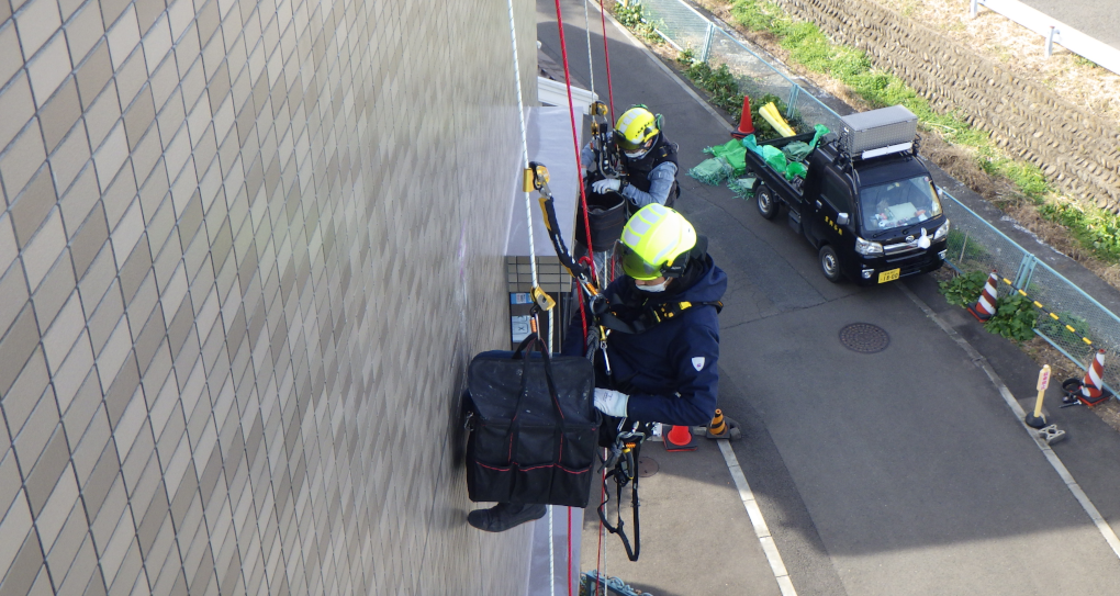 ビル間の狭い場所や屋根の上、ピンポイントの高所工事など、高所作業の際に仮設の足場を使わずにロープにぶら下がって作業を行う「ロープワーク工法」での作業がコストダウンにつながります。また、ドローンによる点検調査も対応可能ですので状況に応じてご提案いたします。